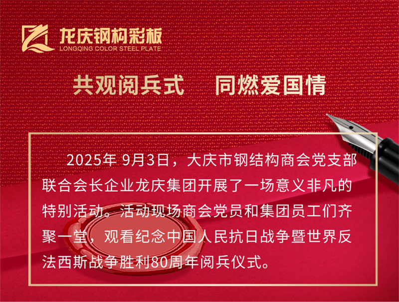 2025年9月3日,大庆市钢结构商会党支部 联合会长企业龙庆集团开展了一场意义非凡的 特别活动。活动现场商会党员和集团员工们齐 聚一堂,观看纪念**人民抗日战争暨**反 法西斯战争胜利80周年阅兵仪式。